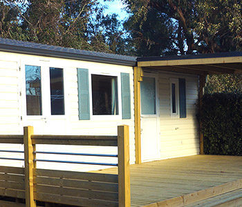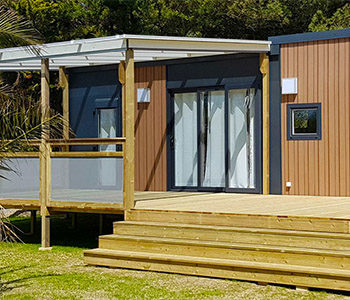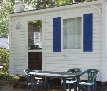 Spacious and modern, the mobile home Roccapina has along its front a large tiled terrace. Comfortable outdoor space and practical on your private plot, this terrace is perfectly arranged to make you spend moments of relaxation and great conviviality. In addition to its classic garden furniture where you can have your meals with your family, you also have an outdoor lounge with coffee table and comfort chairs. Ideal for the aperitif, this low furniture allows you to enjoy the sun during the day or relax in the shade of trees in a comfortable way. An umbrella also equips your terrace.
